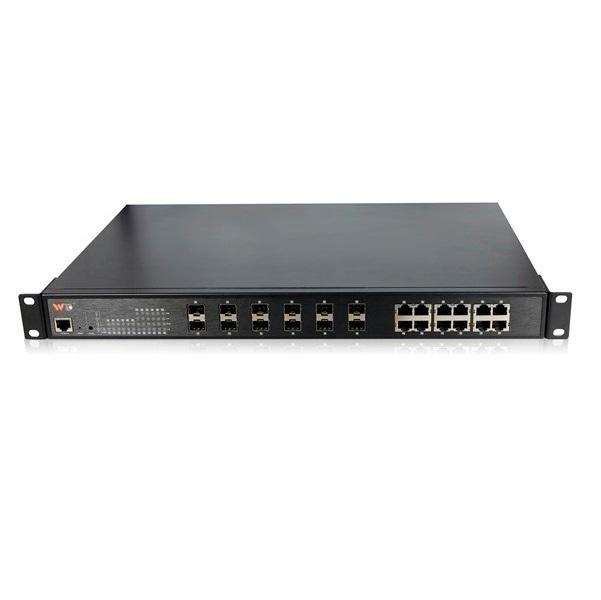 - Hỗ trợ 12 cổng RJ45 10/100/1000M và 12 cổng fiber SFP 10/100/1000M.