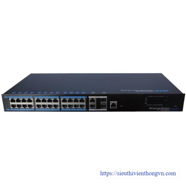 - Provides 24*10/100Mbps downlink PoE Ethernet ports and 2*10/100/1000Mbps uplink Ethernet ports; 2* 1000Mbps uplink SFP ports.