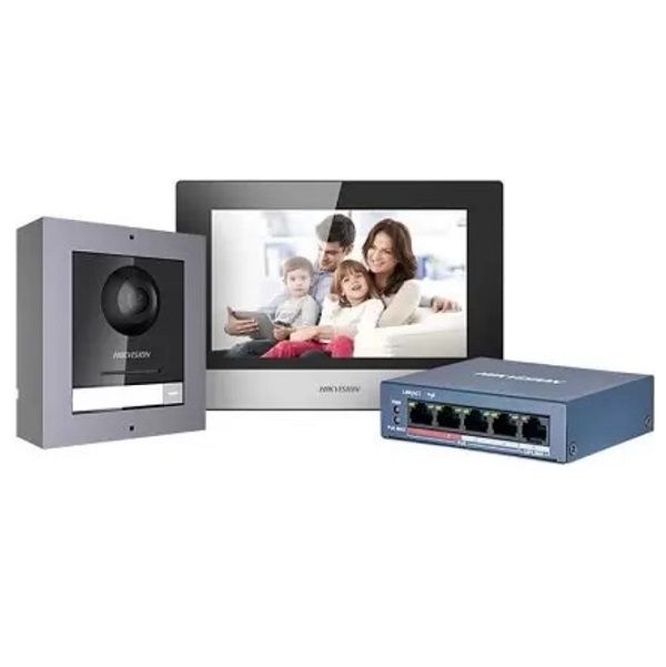 - Bộ Kit chuông cửa IP dành cho biệt thự hoặc nhà ở, có một nút gọi, bao gồm: DS-KD8003-IME1(B)/Surface × 1, DS-KH6320-WTE1 × 1, switch PoE tiêu chuẩn 4 cổng × 1, thẻ TF 16GB × 1.