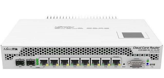 - The CCR1009-7G-1C-1S+PC additionally includes a LCD touchscreen, smart card slot, microSD and a SFP+ port for 10G connections.