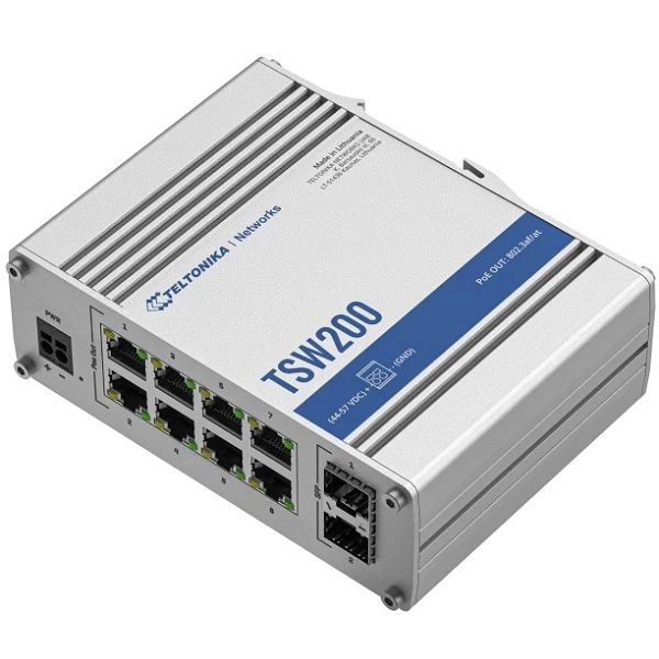 - Teltonika TSW200 là thiết bị chuyển mạch mạng không quản lý, được thiết kế với vỏ nhôm nguyên khối chắc chắn, phù hợp để sử dụng trong môi trường công nghiệp. Với 8 cổng LAN tốc độ 10/100/1000Mbps hỗ trợ công nghệ PoE+ 30W, cung cấp tổng công suất PoE lên đến 240W, giúp cung cấp nguồn điện cho các thiết bị mạng như camera an ninh, bộ phát wifi, điện thoại IP một cách tiện lợi.